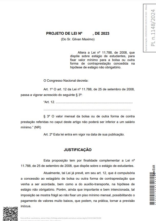 Em um passo significativo para a valorização de uma força de trabalho essencial, o Deputado Federal Gilvan Maximo apresentou o Projeto de Lei nº 1148/2024. A proposta altera a Lei nº 11.788, de 2008, que regulamenta os estágios de estudantes, estabelecendo um piso salarial mínimo para estágios não obrigatórios