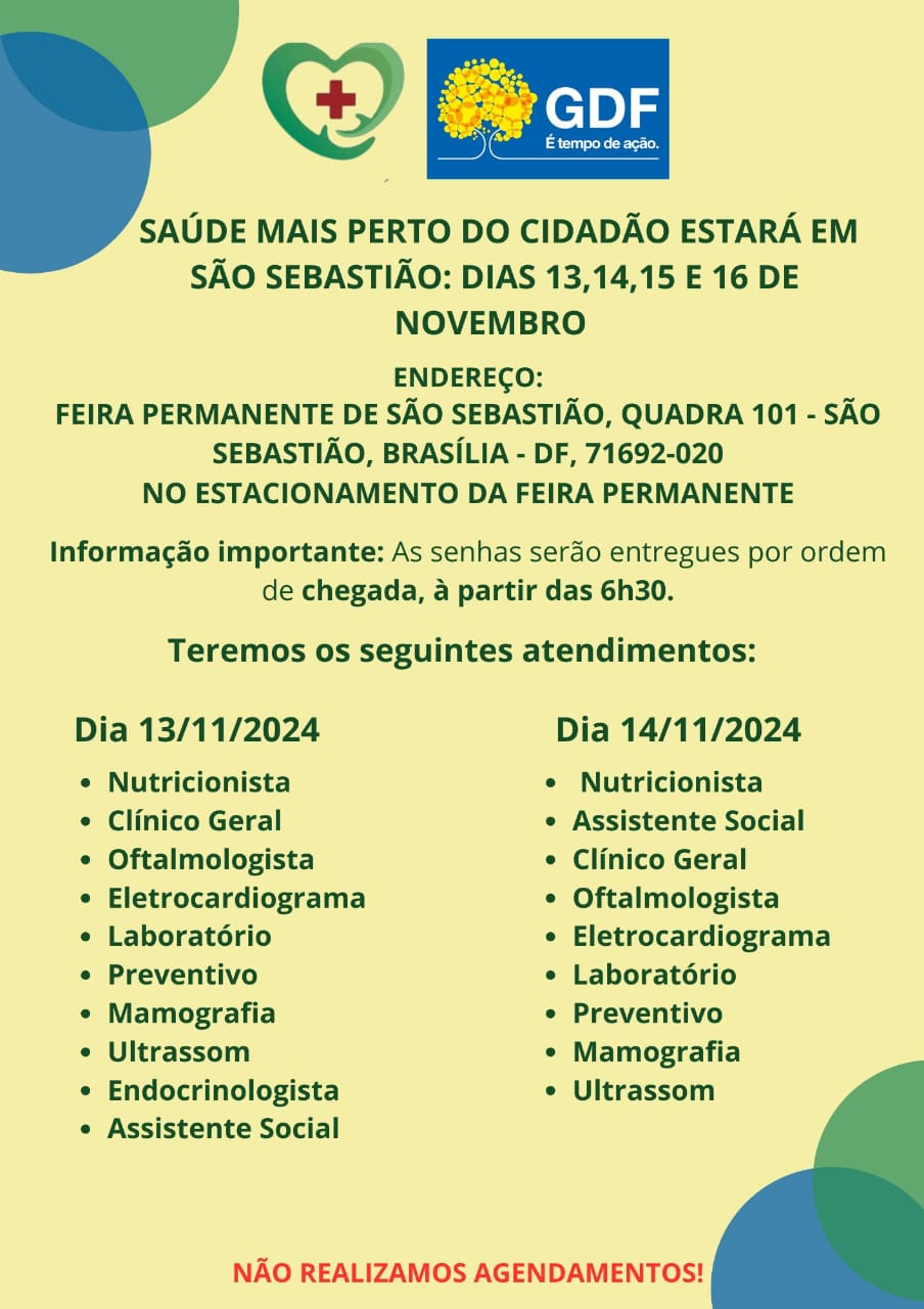 De 13 a 16 de novembro, o programa estará presente na Feira Permanente de São Sebastião, Quadra 101, onde a população poderá acessar gratuitamente uma variedade de especialidades médicas e serviços. Durante esses quatro dias, serão oferecidos atendimentos em clínica médica, nutrição, psicologia, serviço social, ginecologia, nefrologia, cardiologia, endocrinologia, oftalmologia, urologia e mastologia, além de exames de eletrocardiograma, mamografia e ultrassonografia. Em cada dia, as especialidades disponíveis variam, e as senhas serão distribuídas por ordem de chegada a partir das 6h30.